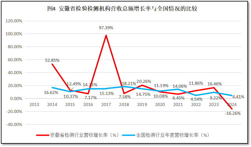 由图4可见,总体来看,除了第一年的离群数据和2017年安徽省出现的极高增速之外,在2015-2023年期间,安徽省检验检测行业年度营收总额的增长率曲线与全国检验检测机构年度营收增长率曲线比较相似,安徽省检验检测机构营收增长率曲线在全国增长率曲线两侧摆动,数值相差不大。但2024年安徽省的曲线出现显著下降,远低于同期全国的数据,效益下滑成为安徽省检验检测行业需要面临的严峻挑战。
